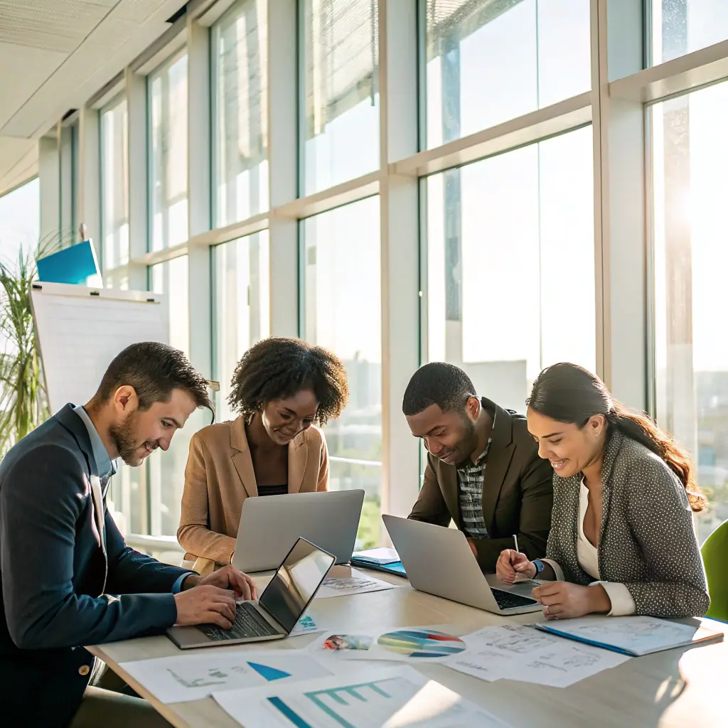 A professional office setting with consultants collaborating on recruitment strategies, showcasing XspaceHR's expertise in talent acquisition.